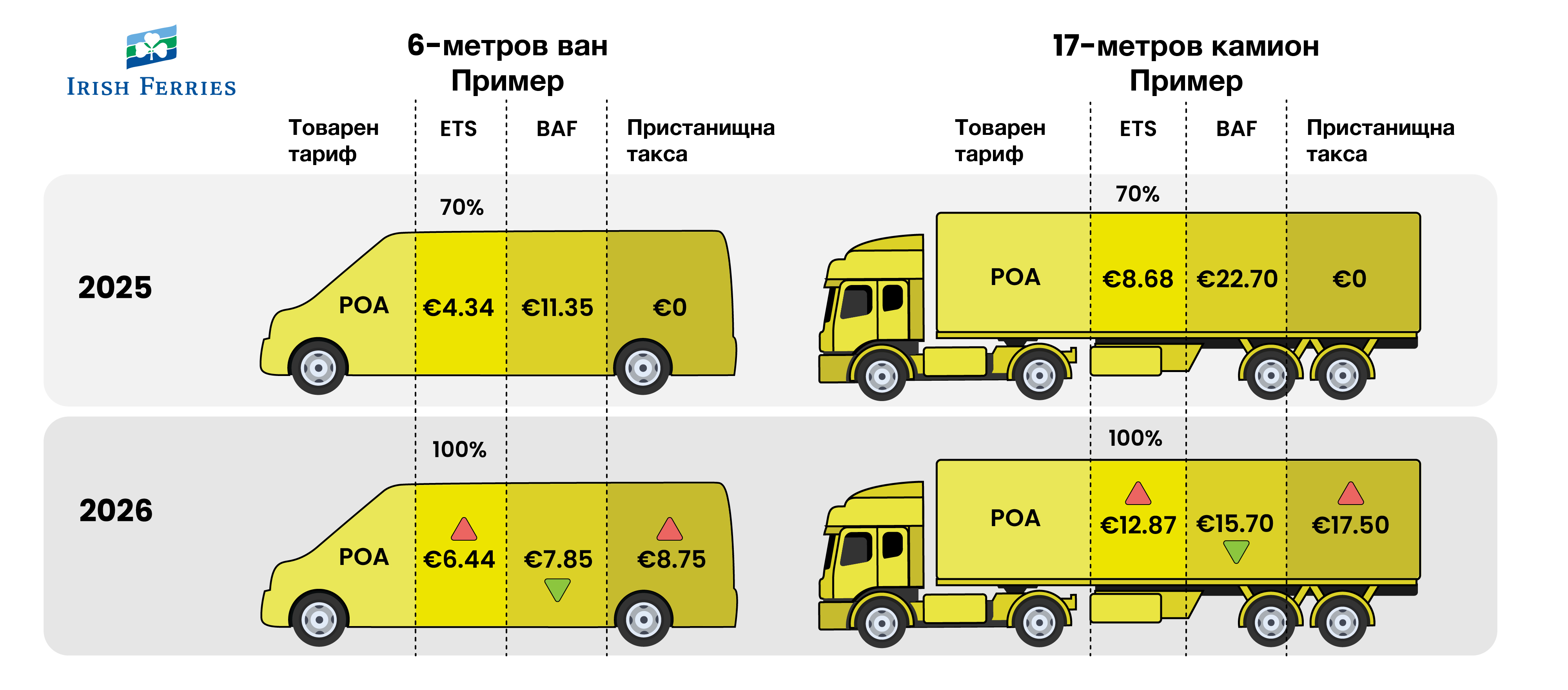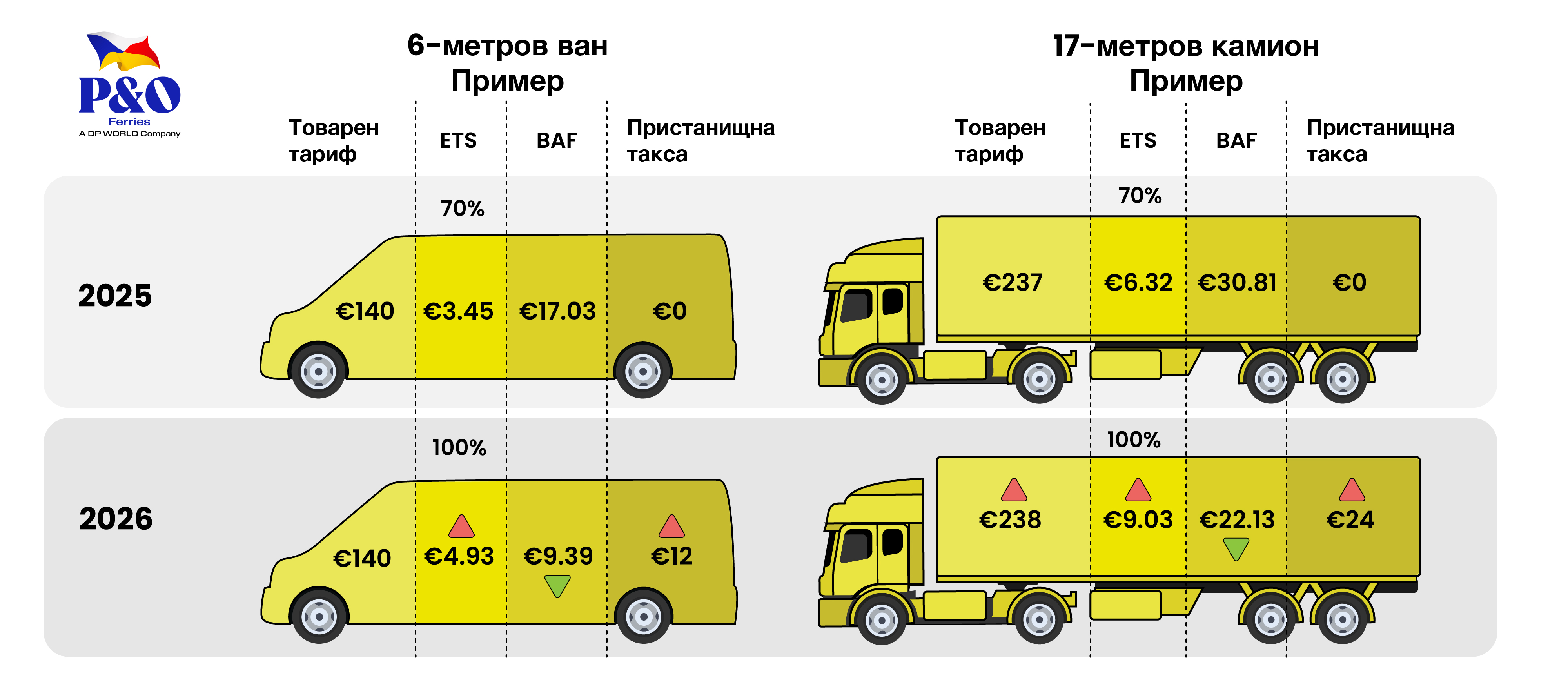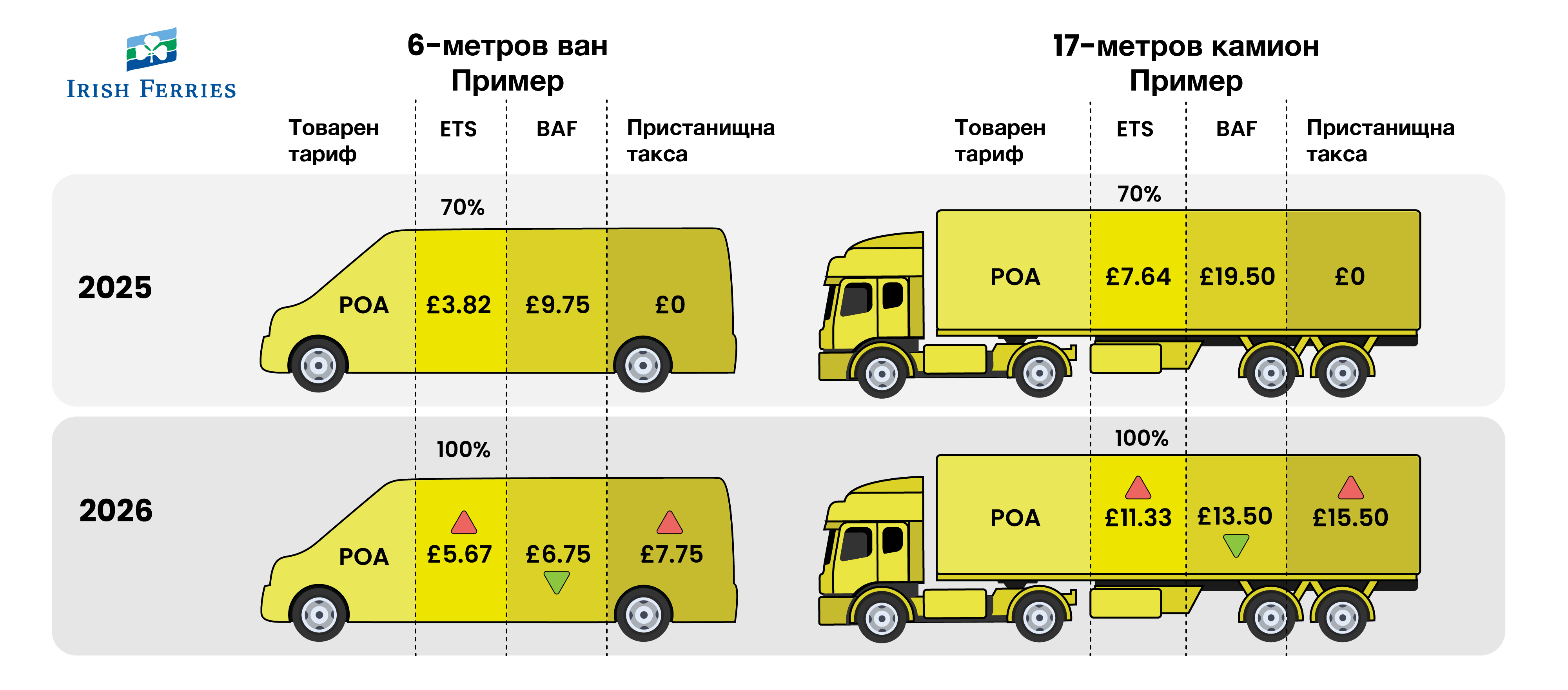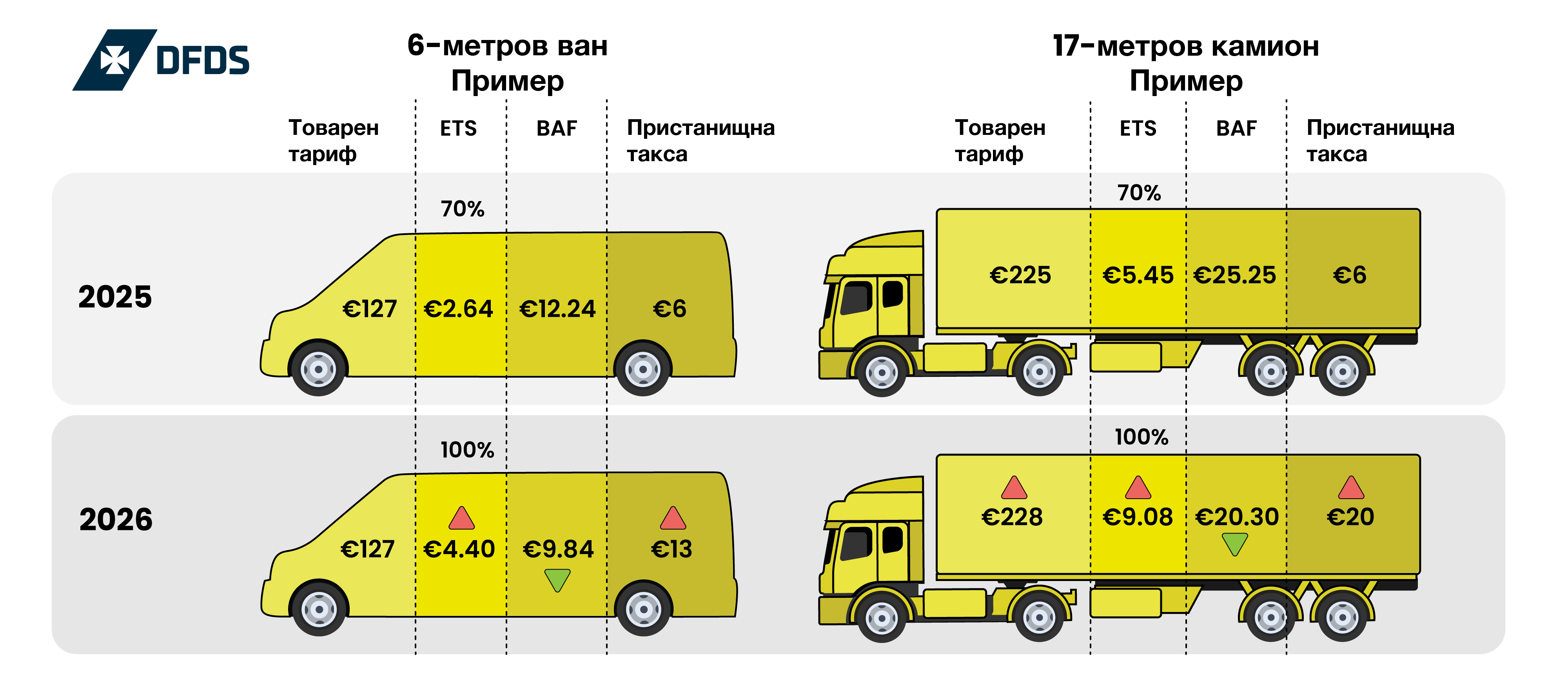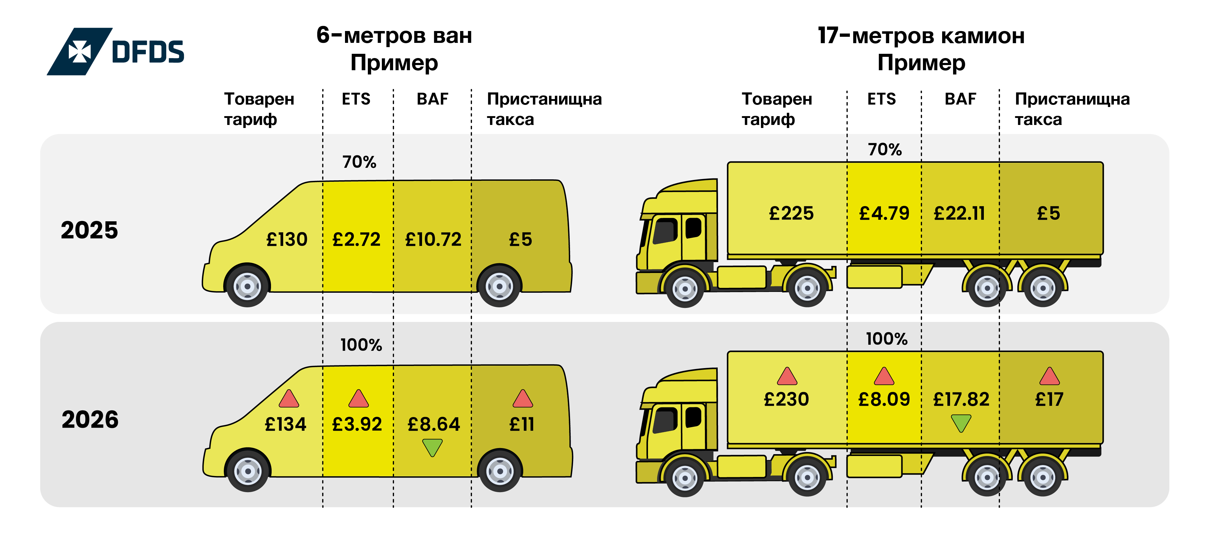 пролива на Dover. Това е в допълнение към таксите ETS (100%) и BAF, както и увеличенията, свързани с инфлацията.